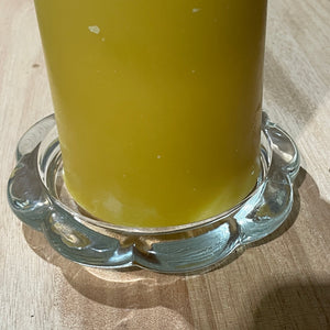 Made from beautiful thick glass to handle the heat from the candles. Our candles burn right to the end, so we recommend a plate to keep the heat off the table.